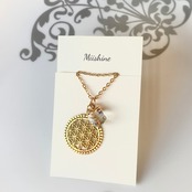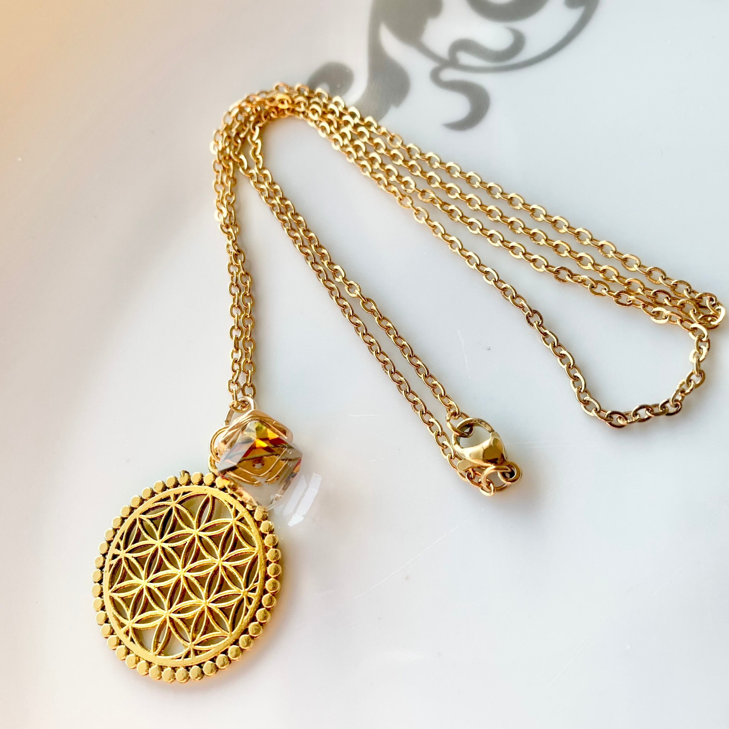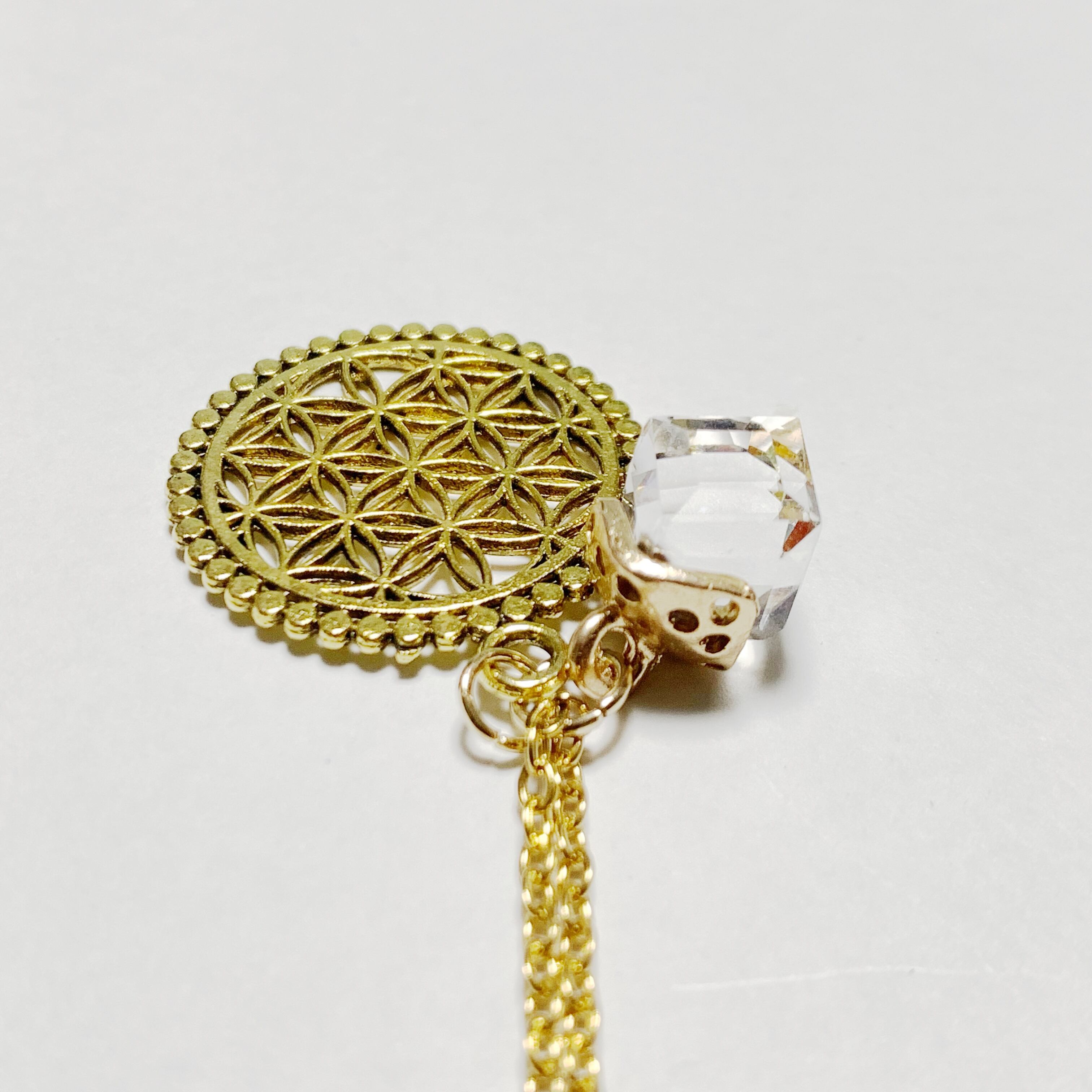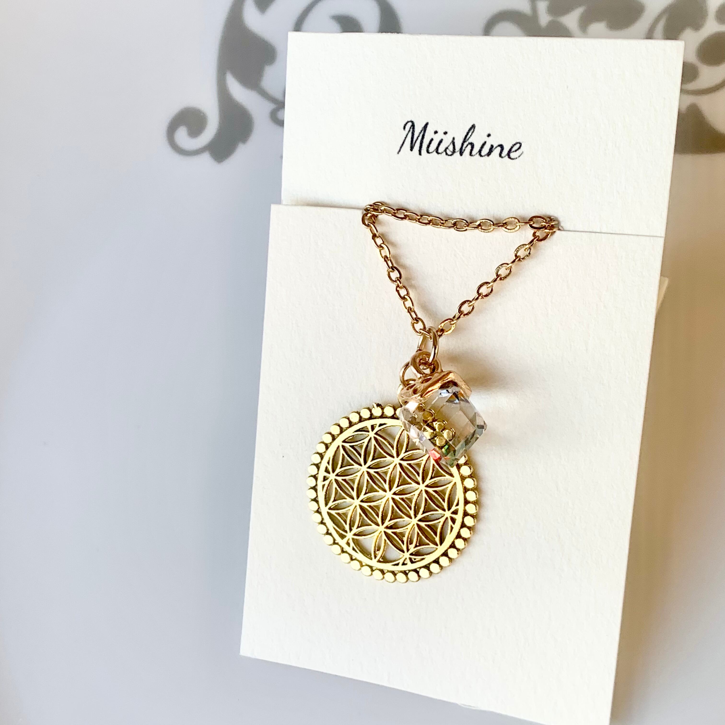 パワフルなフラワーオブライフと見る角度で色が変わるキラキラスクエアビジューのネックレス