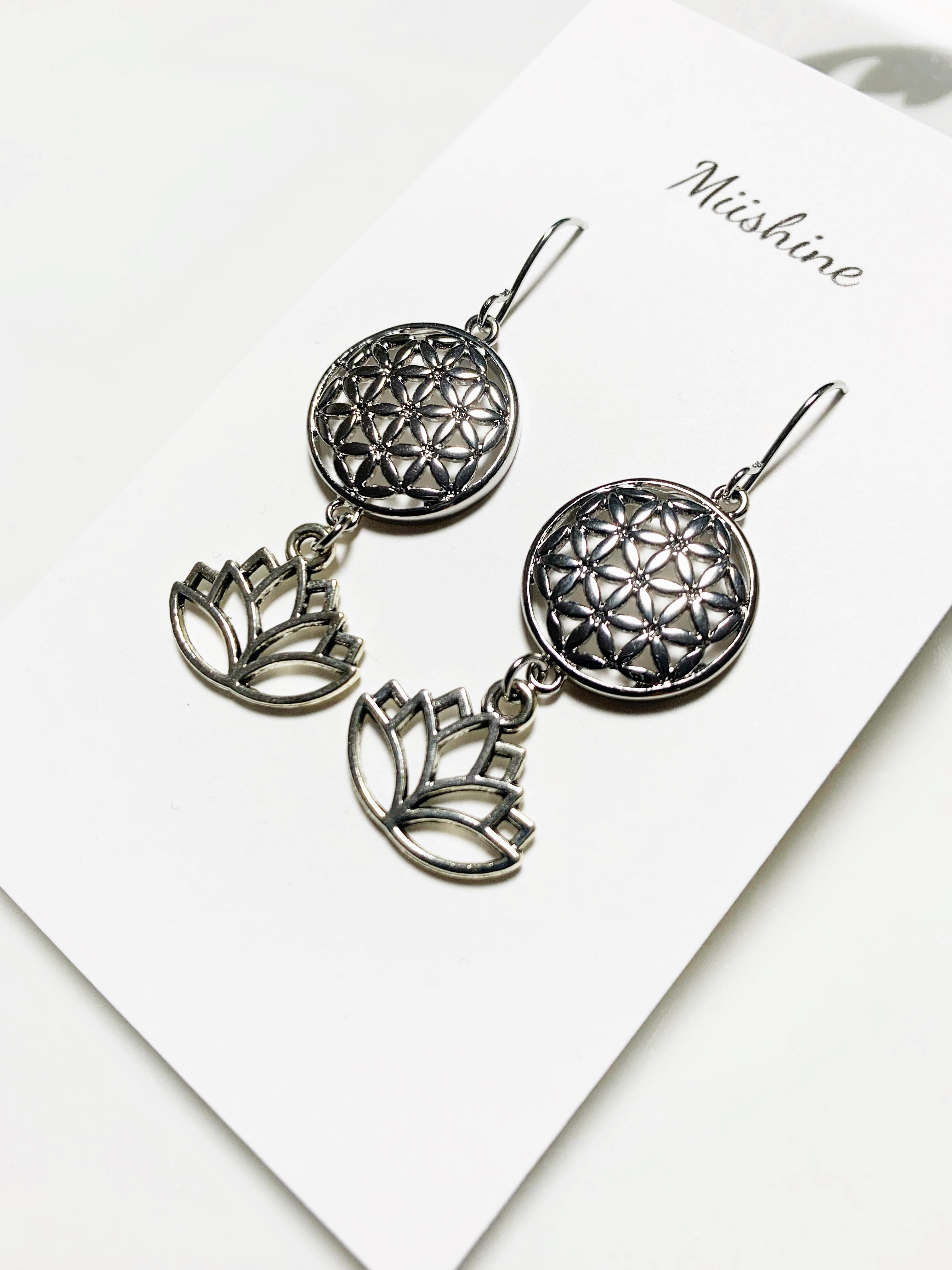 パワフルなフラワーオブライフと蓮の花のピアス