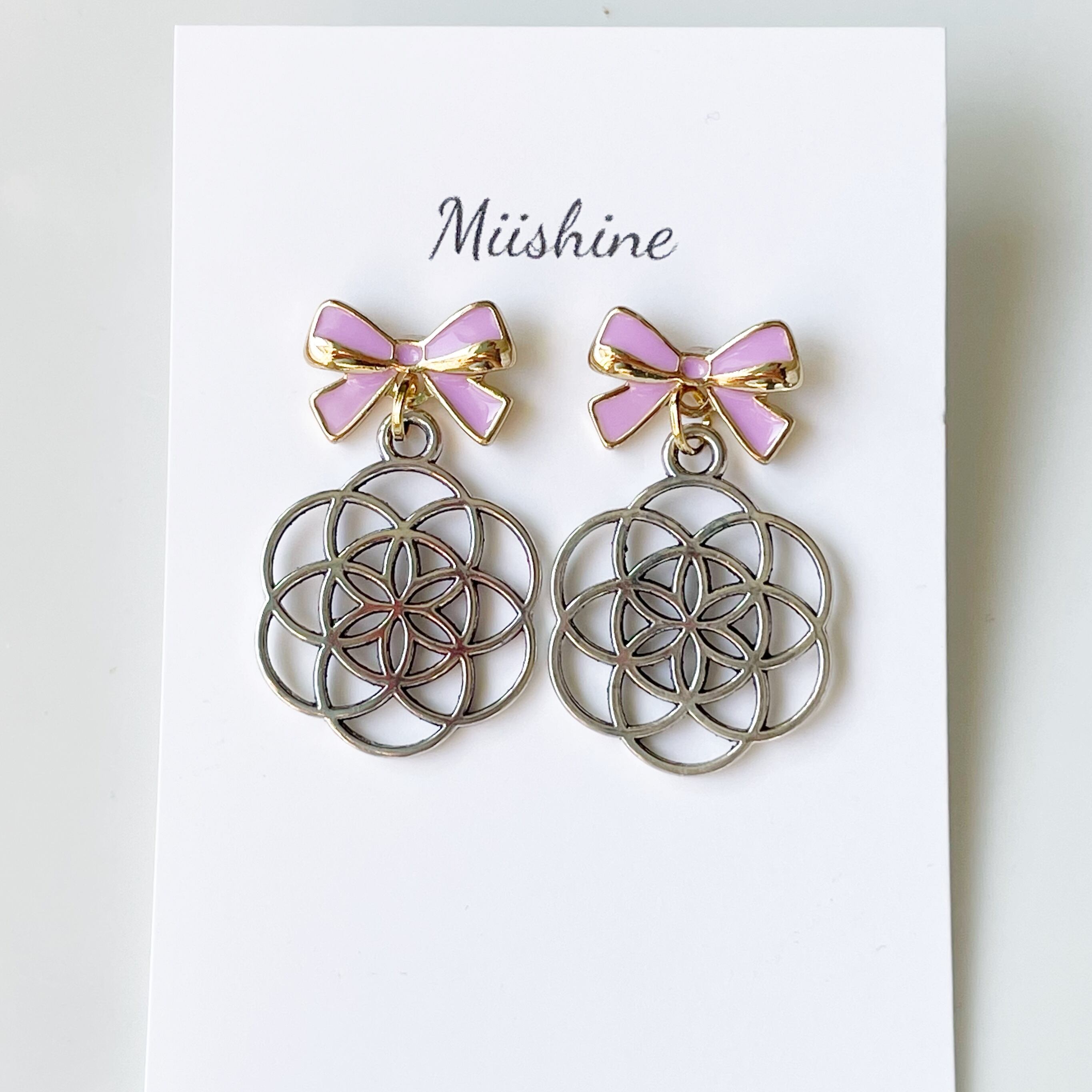 フラワーオブライフを作る重要なパーツであるシードオブライフ と かわいいピンクリボン のピアスです